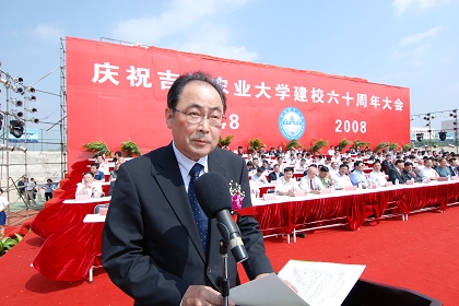 校长秦贵信代表学校致辞。他首先代表学校,向一直支持吉林农业大学发展的各级领导,向长期帮助我校的海内外友好院校的同仁,向满怀深情归来的校友,向所有光临庆典的贵宾和朋友们表示热烈的欢迎和衷心的感谢!秦贵信在致辞中回顾了学校创业、发展、壮大的不平凡历程,特别是进入“十五”以来,学校进一步强化了“服务经济建设和社会发展”的办学理念,全面实施“教学立校、科研强校、人才兴校”治校方略,努力提升办学质量和办学效益、突出办学特色、促进诚信与和谐,确立了教学研究型大学的办学定位。经过六十年的发展,学校办学规模不断扩大,办学层次不断提升,办学结构不断优化,办学质量不断提高,核心竞争力不断增强,在学科建设、人才培养、科学研究、社会服务、大学管理、资源配置等方面取得了历史性跨越。六十年来,学校为社会输送了十余万名优秀人才,在各条战线上尽展了吉农学子风采。广大校友以优秀的品质、斐然的业绩,为母校赢得了广泛的社会赞誉,诠释了母校的功能与价值。秦贵信说,21世纪是中华民族实现伟大复兴的时代,科教兴国、构建社会主义和谐社会、建设社会主义新农村等重大战略决策,为高等教育提出了新的任务和新的要求,也为高等院校提供了难得的发展机遇和广阔的发展空间。面对新形势,我们要以科学发展观为指导,注重学校外延与内涵的和谐发展,切实把握人才培养的时代性、科学研究的创新性、社会服务的实效性、文化传承的方向性,追求大学理想,铸就大学精神,完善大学职能,实现大学的更高价值。作为农业大省的农业大学,我们将紧扣社会发展主旋律,坚持“服务经济建设和社会发展”的办学理念,突出农科特色与优势,努力培养优秀人才,推动科技创新,促进社会进步,为区域乃至全国经济社会发展做出新的更大的贡献。秦贵信在致辞最后表示,农大人决不辜负前辈们的殷殷重托,一定会肩负起祖国和人民赋予的神圣使命。吉林农业大学将在省委、省政府的领导下,在各级领导的关怀下,在社会各界朋友和广大校友的支持下,发扬传统,开拓进取,为早日把学校建设成为以农为优势和特色的多科性教学研究型先进大学而努力奋斗!
