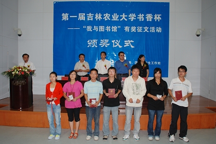 9月2日,吉林农业大学第一届“书香杯——我与图书馆”有奖征文活动颁奖仪式在图书馆同声传译报告厅举行。校长秦贵信、校党委副书记温成涛、图书馆馆长陈光、学生处处长丁庆东、校党委宣传部副部长李蕾出席了颁奖仪式,校图工委委员、获奖同学和部分学生代表200余人参会。仪式由校团委书记于运国主持。 为全面建设和谐书香校园,增强青年学生读书意识,展现读书成果,提高图书馆电子资源利用率,实现图书馆与读者之间的良性互动,学校图书馆、学生处、校团委联合超星数字图书馆在全校青年学生中开展了第一届“书香杯——我与图书馆”有奖征文活动。征文通知发出后,我校广大青年学生积极参与,踊跃投稿,稿件题材多样,内容丰富。经过评审委员会的认真评审,共评出获奖作品38篇,其中一等奖3篇,二等奖5篇,三等奖10篇,参与奖20篇。 颁奖仪式上,陈光宣读了《关于表彰吉林农业大学第一届“书香杯——我与图书馆”有奖征文获奖者的决定》;与会领导为获奖的38名同学颁发了奖品与证书;生命科学学院董丽娜同学代表获奖同学发表读书体会和获奖感言。 秦贵信对本次征文活动给予了高度评价。他指出,学校将进一步重视文化的引领作用,着力打造书香校园,积极创建学习型组织,努力创设学习化、人文化的校园文化生态。他希望全校师生都能踊跃参与到多读书,读好书,善于读书的行列中来,希望图书馆全体员工充分发挥育人作用,主动为教学、科研、学科建设服务,继续为广大读者提供完善、优质服务,真正让图书馆成为全校师生的“精神家园”,成为青年学生最向往的地方,成为人才成长的摇篮,为推动我校文化建设,构建和谐校园,实现学校的跨越式发展做出新的、更大的贡献。
