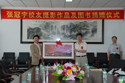 9月5日,我校知名校友张冠宇先生摄影作品及图书捐赠仪式,在图书馆B区3楼会议室隆重举行。学校党委书记姚秋杰,副校长张立峰,校庆办主任肖淑霞,图书馆馆长陈光、副馆长李阿丽、副馆长陈文勇及校图工委委员,图书馆部分员工和学生代表参加了捐赠仪式。 陈光主持捐赠仪式。她代表此次活动组委会对出席捐赠仪式的各位领导,各位来宾表示最热烈的欢迎和最诚挚的感谢!并向大家介绍了张冠宇先生的主要业绩。 张冠宇先生心系母校的建设和发展,向母校捐赠《我热恋的故乡》等摄影作品500幅、《人生语录》等图书240册。 仪式上,伴随着欢快、热烈的乐曲,党委书记姚秋杰接受校友张冠宇捐赠的摄影作品及图书;之后,姚秋杰为张冠宇颁发了荣誉证书,张立峰为张冠宇颁发了收藏证书。 张冠宇发表捐赠感言。他说:学校发生了翻天覆地的变化,特别是在校园文化建设方面做出了非常大的努力,并且收到了非常好的成效,我作为吉林农业大学的学子感到非常高兴;这次看到很多校友和新生力量,是人生的一大幸事,在布置摄影作品期间,图书馆员工和同学们付出了大量的辛勤劳动,这种对文化事业的重视让我非常感动;作为农大的一位普通的校友,学校能为我举办这么隆重的仪式,我感到非常荣幸和骄傲。回到母校,我为自己的作品找到了理想和永久的家园。 姚秋杰在捐赠仪式上作了重要讲话。他对张冠宇先生为母校的捐赠义举给与高度评价,并希望通过今天这个契机,在校园文化建设方面,对我校的老师和同学是一个更好的思想飞跃和前景展望,祝愿我们与张老师的友情源远流长,祝愿我们的学校明天更美好。