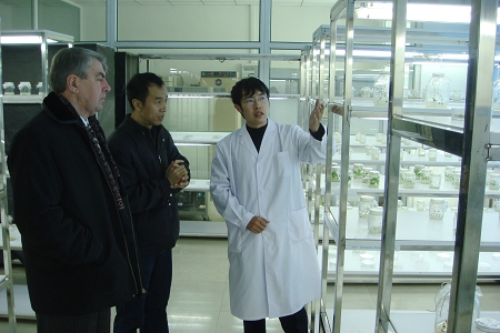 卡萨洛维奇·尼加拉伊校长(左一)参观学校生物工程研究中心时在听取博士研究生介绍情况
