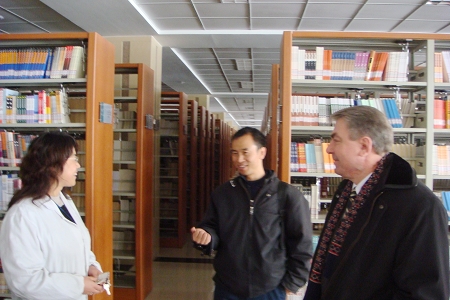 卡萨洛维奇·尼加拉伊校长(右一)在参观学校图书馆时与工作人员交谈