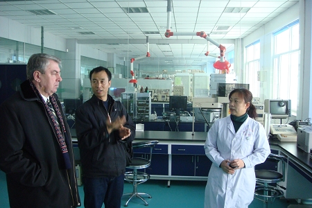 卡萨洛维奇·尼加拉伊校长(左一)参观学校生物反应器与药物开发教育部工程研究中心