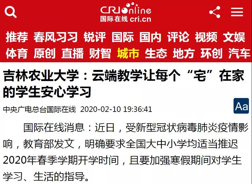 2月10日,中央广电总台国际在线以《吉林农业大学:云端教学让每个“宅”在家的学生安心学习》为题,对我校云端教学进行了采访报道。