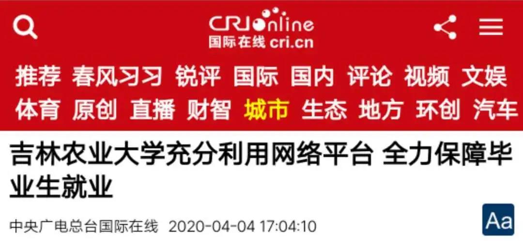 4月4日, 中央广电总台国际在线以《吉林农业大学充分利用网络平台 全力保障毕业生就业》为题,对我校充分利用网络平台,全力保障毕业生就业进行了报道。