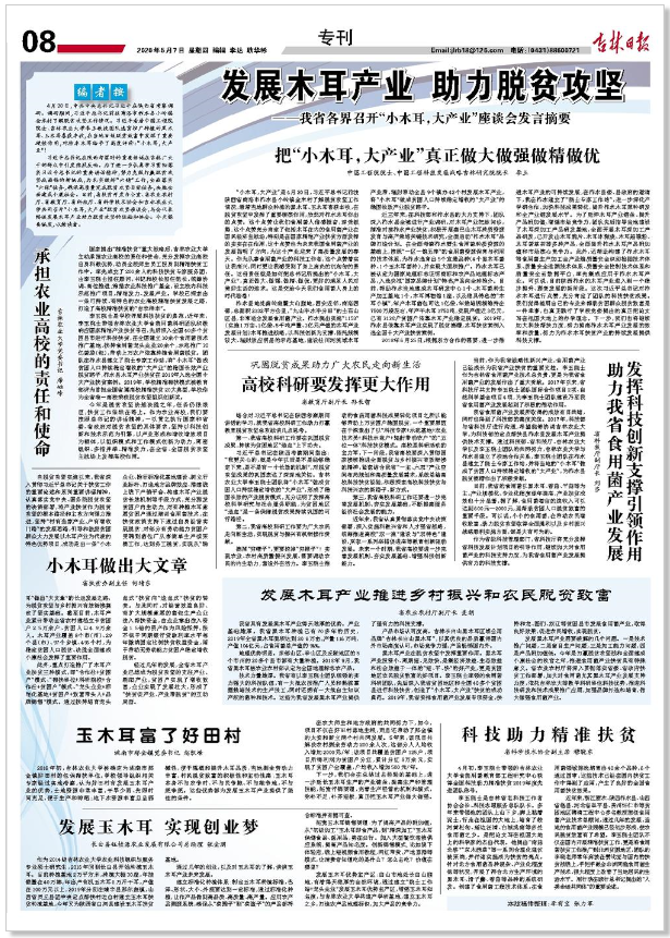 5月7日,吉林日报以《发展木耳产业助力脱贫攻坚——我省各界召开“小木耳,大产业”座谈会发言摘要》专刊整版报道了在我校召开的“小木耳,大产业”座谈会发言摘要。