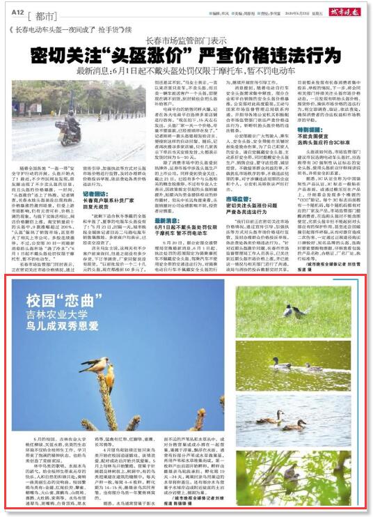 5月22日,城市晚报以《校园“恋曲” 吉林农业大学 鸟儿成双秀恩爱》为题,对我校优美的校园生态环境进行了配图报道。