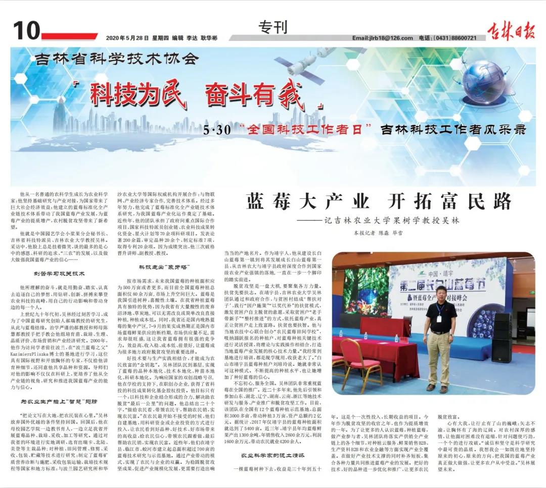 5月28日,吉林日报以《蓝莓大产业,开拓富民路——记吉林农业大学果树学教授吴林》为题,对我校教授吴林进行了采访报道。