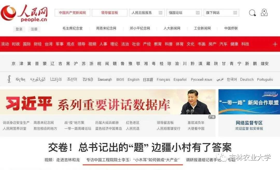 7月14日,人民网-中国共产党新闻网以《"小木耳"如何做成"大产业"——专访中国工程院院士李玉》为题,对中国工程院院士、我校教授李玉进行了采访报道。
