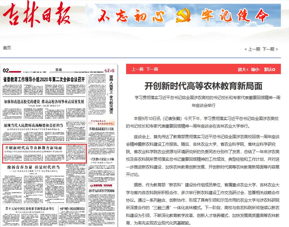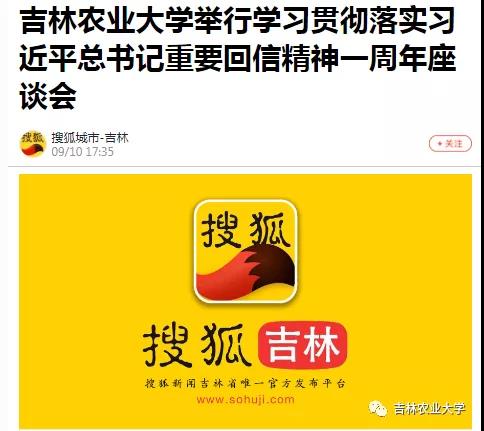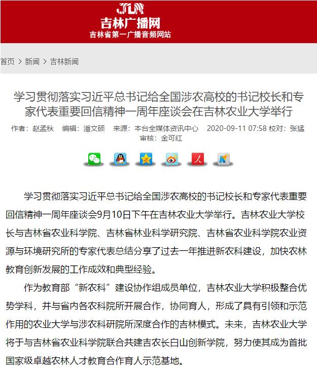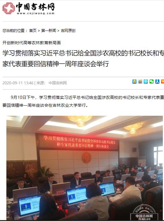 9月11日,新华社、吉林日报、吉林卫视吉林新闻联播、搜狐网、中国吉林网、吉林广播网、学习强国吉林学习平台等采访报道了我校组织召开的学习贯彻落实习近平总书记给全国涉农高校的书记校长和专家代表重要回信精神一周年座谈会。