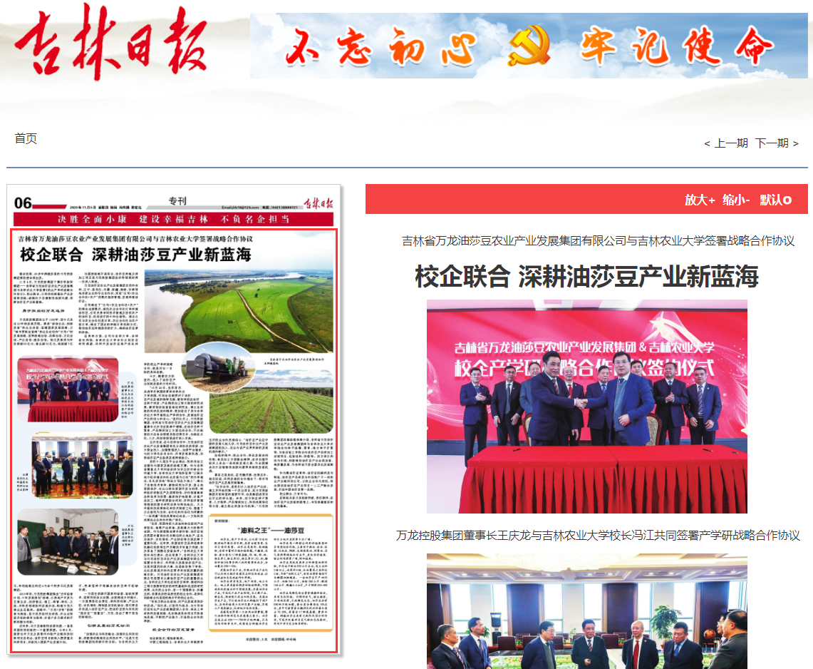 11月5日,吉林日报以《校企联合 深耕油莎豆产业新蓝海》为题,对我校与吉林省万龙油莎豆农业产业发展集团有限公司签署战略合作协议进行了报道。