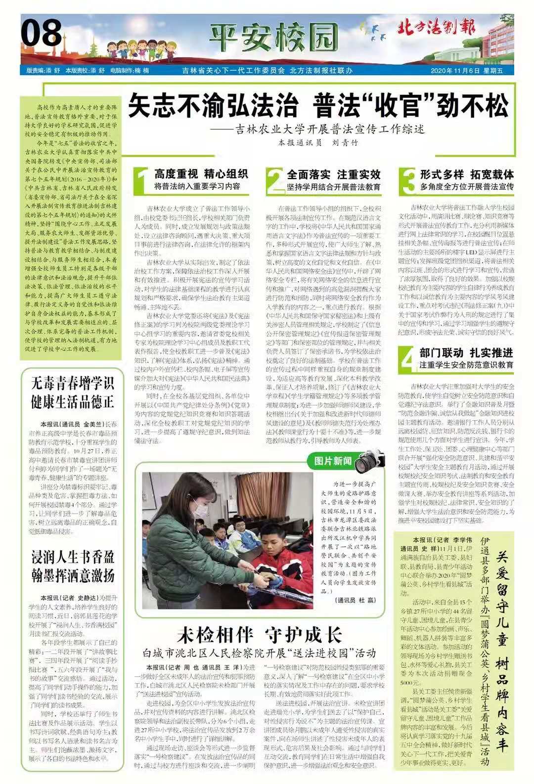11月6日,北方法制报以《矢志不渝弘法治 普法“收官”劲不松——吉林农业大学开展普法宣传工作综述》为题,对我校普法宣传工作进行了报道。