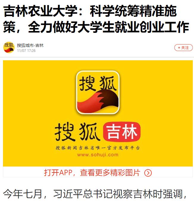 11月7日,搜狐网以《吉林农业大学:科学统筹精准施策,全力做好大学生就业创业工作》为题,对我校就业创业工作进行了采访报道。