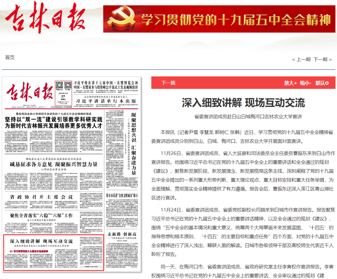 11月21日、23日、27日,中国吉林网、吉林卫视吉林新闻联播、吉林日报分别以《吉林省委宣讲团党的十九届五中全会精神报告会在吉林农业大学举行》《学习贯彻党的十九届五中全会精神省委宣讲团赴吉林市 四平市 长白山 吉林农业大学宣讲》《深入细致讲解 现场互动交流 省委宣讲团成员赴白山白城梅河口吉林农业大学宣讲》为题,对学习贯彻党的十九届五中全会精神省委宣讲团成员、省委教育工委专职副书记张殿锋到我校宣讲党的十九届五中全会精神进行了报道。人民网、新华网、腾讯网、吉林广播网进行了转载。