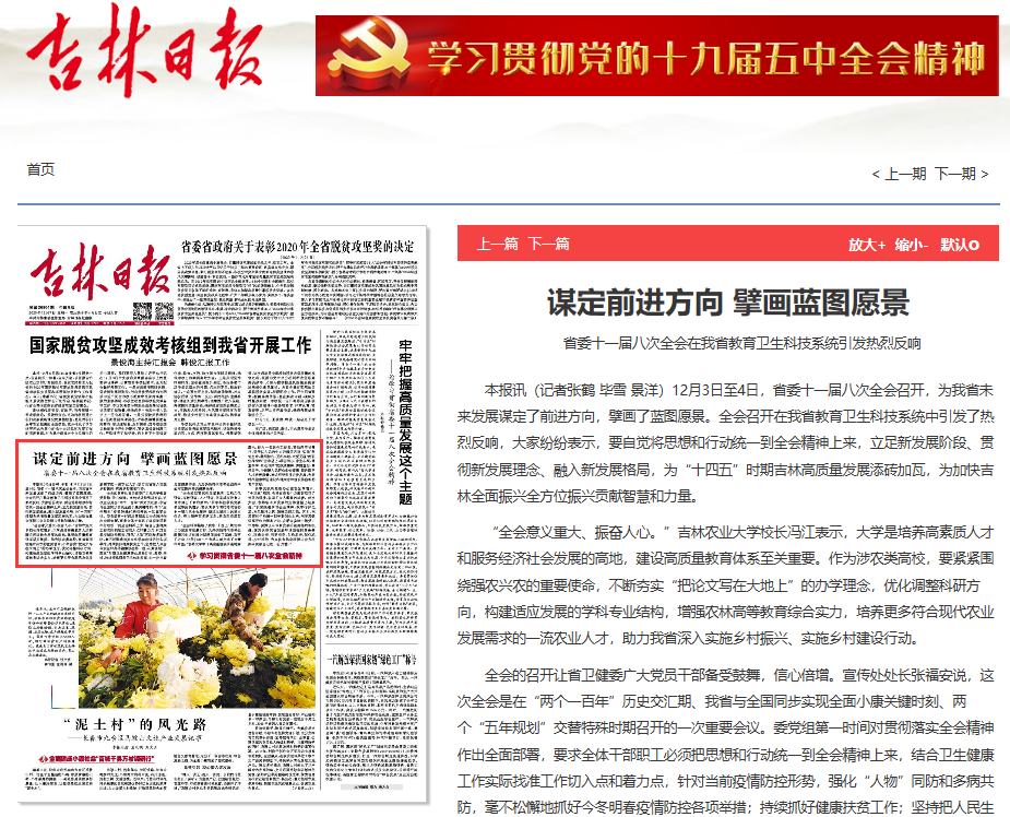 12月7日,吉林日报以《谋定前进方向 擘画蓝图愿景 省委十一届八次全会在我省教育卫生科技系统引发热烈反响》为题,对我校校长冯江进行了采访报道。