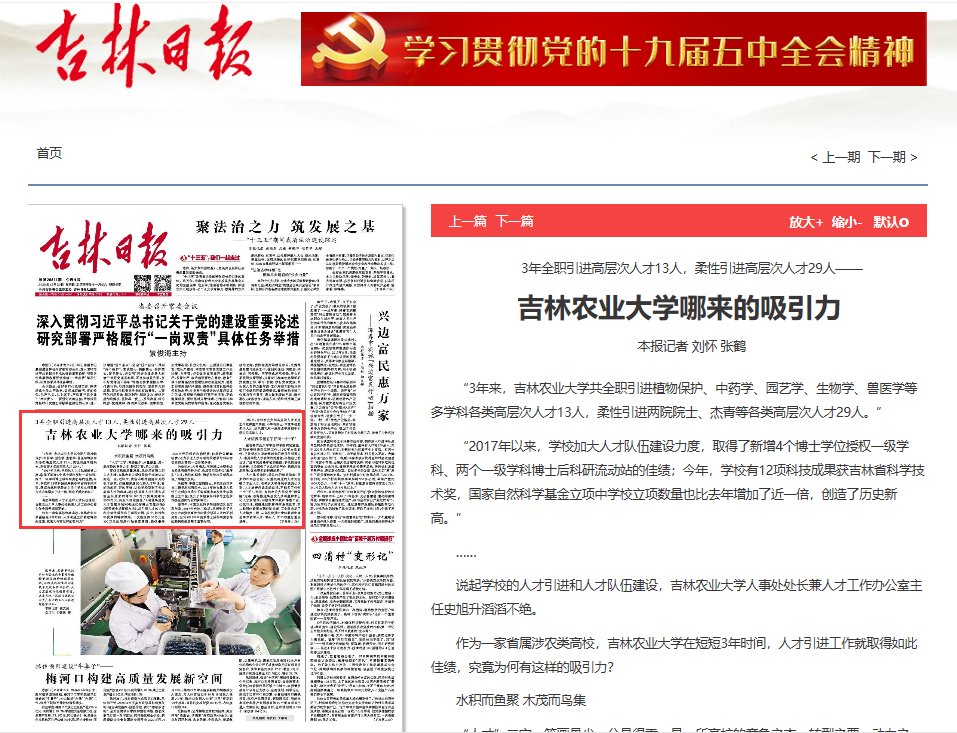 12月20日,吉林日报头版以《3年全职引进高层次人才13人,柔性引进高层次人才29人——吉林农业大学哪来的吸引力》为题,对我校人才工作进行了采访报道。人民网、搜狐网、腾讯网、网易新闻、澎湃新闻、凤凰网进行了转载。