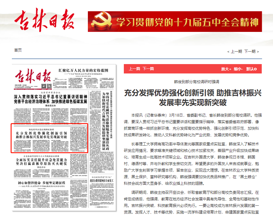 3月20日,吉林日报以《韩俊到部分高校调研时强调 充分发挥优势强化创新引领 助推吉林振兴发展率先实现新突破》为题,对省委副书记、省长韩俊到我校调研进行了采访报道。