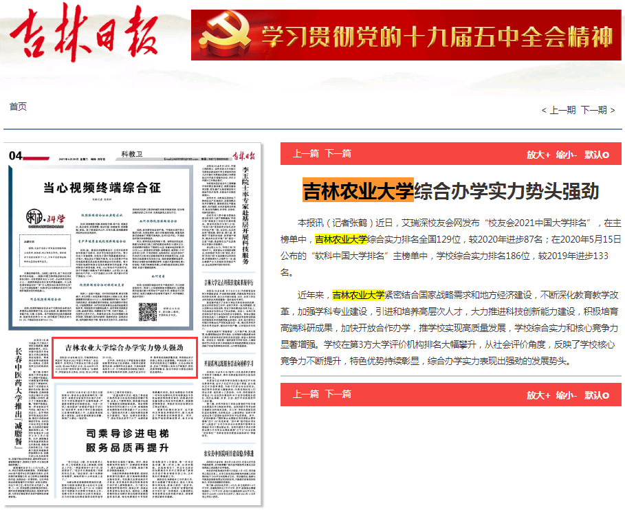 4月20日,吉林日报以《吉林农业大学综合办学实力势头强劲》为题,对我校在第3方大学评价机构排名中大幅攀升进行了报道。
