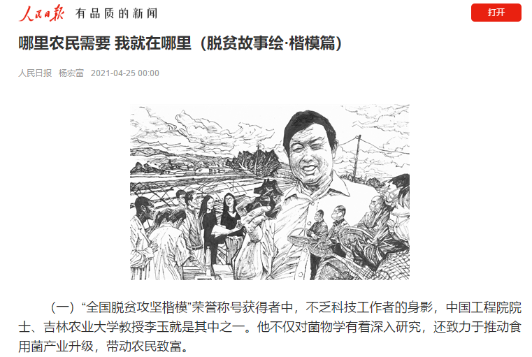 4月25日,人民日报以《哪里农民需要 我就在哪里(脱贫故事绘·楷模篇)》为题,刊发了由国家一级美术师杨宏富创作的6幅展现“全国脱贫攻坚楷模”荣誉称号获得者、中国工程院院士、我校教授李玉的绘画作品。