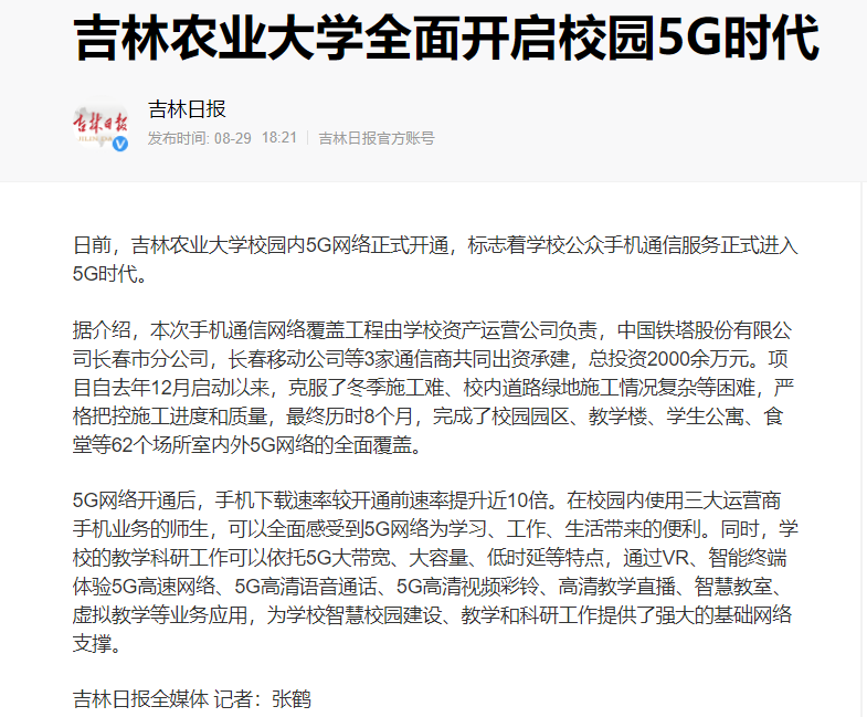 8月29日,吉林日报分以《吉林农业大学全面开启校园5G时代》为题,对我校完成校园5G网络建设工作进行了报道。