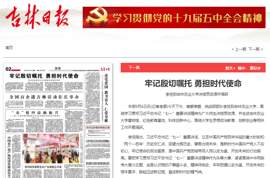 9月7日,吉林日报以《牢记殷切嘱托 勇担时代使命 李悦到吉林农业大学讲授思政课并调研》为题,对省委常委、统战部部长李悦到我校讲授思政课并调研进行了采访报道。