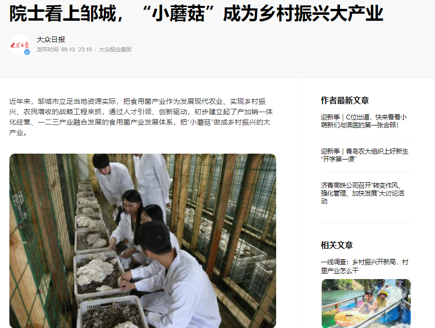 9月13日,大众日报以《院士看上邹城,“小蘑菇”成为乡村振兴大产业》为题,对我校李玉院士团队帮助山东省邹城市把“小蘑菇”做成乡村振兴的大产业进行了采访报道。