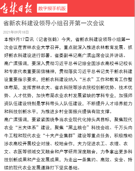 9月17日、18日,吉林卫视吉林新闻联播、吉林日报以《省新农科建设领导小组召开第一次会议》为题,对在我校召开的省新农科建设领导小组第一次会议进行了采访报道。人民网进行了转载。