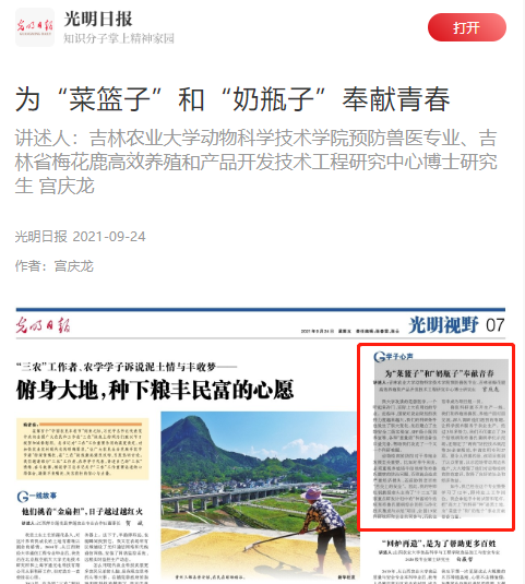 9月24日,光明日报以《为“菜篮子”和“奶瓶子”奉献青春》为题,对我校动物科学技术学院预防兽医专业、吉林省梅花鹿高效养殖和产品开发技术工程研究中心博士研究生宫庆龙进行了采访报道。
