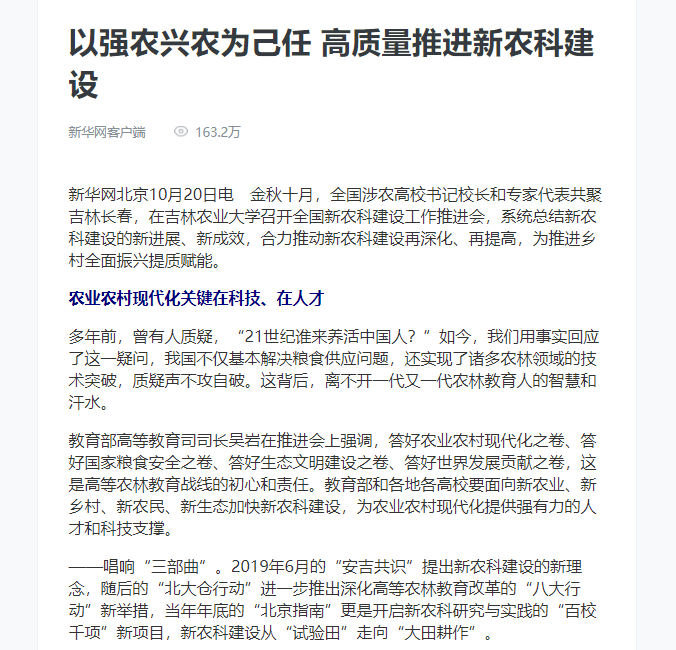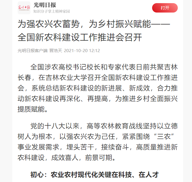 10月19日—20日,全国新农科建设工作推进会在吉林农业大学顺利召开,人民网、光明日报、新华网、中央广电总台国际在线、中国教育报、中国教育电视台、中国青年报、吉林日报、吉林卫视、中国吉林网、学习强国平台等10余家中省直媒体集中报道了大会盛况。人民网对我校校长冯江进行了专访。吉林日报对我校新农科建设成果进行了专题报道。